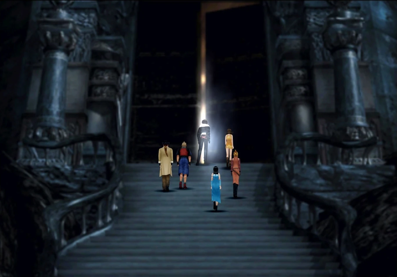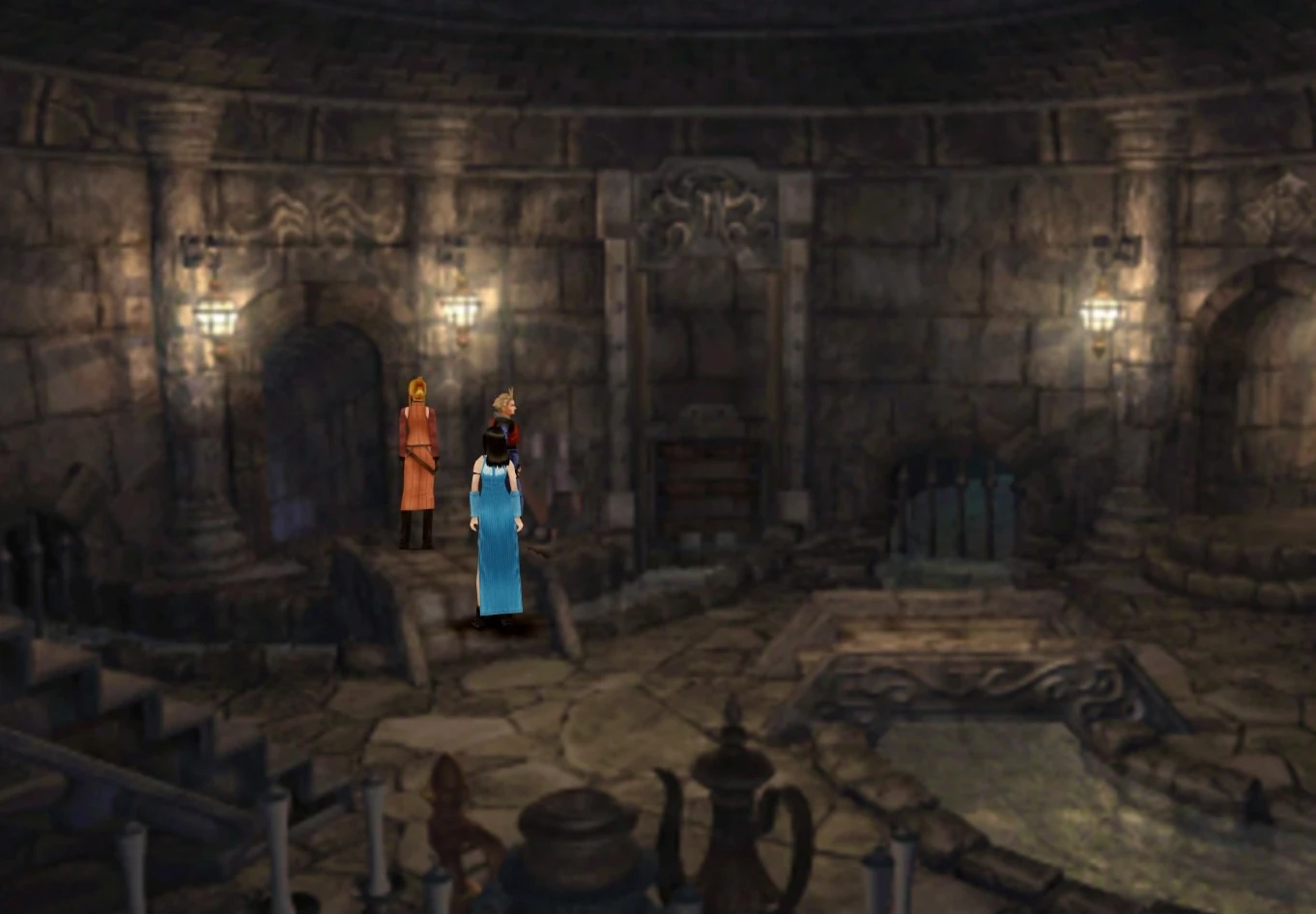 Der rechte Treppenflur ist von der Eingangshalle aus erreichbar und führt weiter in die Galerie. Hier befinden sich ein Team-Umschaltepunkt und eine Glocke, die Omega Weapon in der Kapelle erscheinen lässt, wenn man sie läutet.
