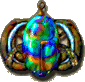 Es ist bei den einfachen Leuten als Glücksbringer beliebt und strahlt ein regenbogenfarbenes Leuchten aus. Ein Skarabäus ist die Abbildung des Pillendrehers in der altägyptischen Kunst. Er galt wohl als Symbol der Wiedergeburt. | ||