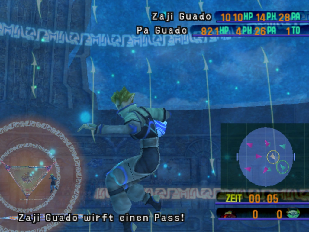 - Pass: Der Spieler wirft einem anderen Spieler den Ball zu. Ein Pass verbraucht HP, der Wert wird angezeigt - je höher dieser Wert ist, desto höher ist auch die Reichweiter des Wurfs. Beeinflusst wird diese jedoch vom PA-Wert des Spielers, der sich beim Flug des Balls kontinuierlich verringert. Fällt er auf 0, bevor der Angespielte den Ball fangen konnte, misslingt der Pass und der Ball wird von einem anderen Spieler aufgenommen. Beherrscht der Spieler verschiedene Pass-Abilitys, kann eine ausgewählt werden, nachdem Pass angewählt wurde.