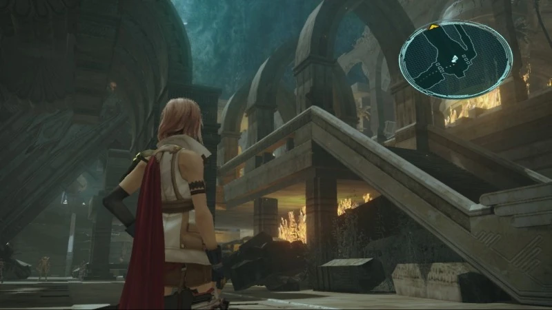 Sie finden ein Mutterschiff und eine kleine Basis von PSIKOM, die womöglich gerade Überlebende der Purgation jagen. Zwischen ihnen entbrennt eine Diskussion über Pulse und Cocoon, dass sie eine tiefe Furcht trennt und dass bislang immer der oberste Sanktum-Fal'Cie Eden intervenierte, doch diesmal nicht. Auf dem weiteren Weg verlassen sie den See und betreten eine zertrümmerte Ruinenstadt, die zum Zeitpunkt des Absturzes des Residuums von Anima gebrannt haben muss, da die Flammen ebenfalls kristallisierten. Dort finden sie einen funktionsfähigen PSIKOM-Luftgleiter samt Startrampe, den sie kurzerhand stehlen.