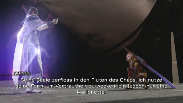 Raines selbst wollte seinerzeit als Mensch Cocoon den Menschen wiedergeben, doch dies änderte sich, als er ein L'Cie wurde und an seine Bestimmung gebunden war. Er verlor die Hoffnung und beinahe seinen Traum von Freiheit. Er stehe nun hier aus freien Stücken, nicht auf Geheiß der Fal'Cie. Zu sehen, wie sie kämpften, brachte ihm diese verlorene Hoffnung zurück. Wenn er sie hier besiegen kann, scheitert der Plan der Fal'Cie. Er glaubt dabei wirklich, die L'Cie dadurch befreien zu können und etwas Gutes zu tun, doch sie bezwingen ihn. Nach dem Kampf gibt er zu, nur einen Moment des Triumphs gewollt zu haben, wie es dazu käme, sei nicht wichtig. Sie sollen tun, was sie für richtig halten und sich selbst vertrauen, dann verwandelt er sich in Kristall und erfüllt somit seine Bestimmung, die darin lag, die Gruppe auf ihrem Weg zu begleiten und zu unterstützen. Seine Kristallstatue löst sich untypischerweise aber langsam in Licht und Luft auf.