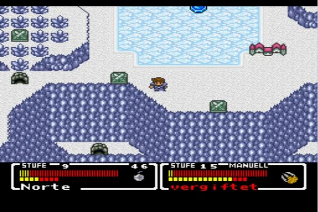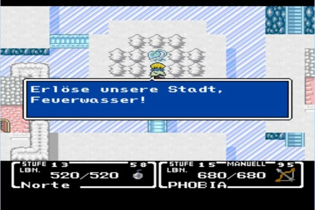 Zieht dann ostwärts weiter und räumt im Vorübergehen die beiden Schlachtfelder ab, wofür ihr beim zweiten den Narrenring erhaltet. Dann betreten wir Aquaria und schauen uns eine Runde um. In dem Inn könnt ihr euch gegen Bezahlung erholen und Bomben einkaufen, wenn euch danach ist. Im oberen linken Haus gibt es für 200 GM den Plutohelm zu erstehen, den ihr euch holen solltet und Ambrosia in einer Kiste. Haben wir alles, begeben wir uns in Phobias Haus, das sich im vorderen linken Bereich der Stadt befindet. Sie wird uns sagen, dass Spencer sich im Eistunnel unter uns befände und dieser bei Grabungsarbeiten eingestürzt sei. Oh noes! Unser Held will daraufhin wissen, ob das Eis nicht schmelzbar wäre, worauf Phobia meint, dass das nur mit Feuerwasser (= Whiskey?!) aus der Quelle des Lebens gehen würde. Um zu dieser Quelle zu gelangen, bräuchten wir jedoch zunächst den Libra Opal, der sich in der Winterhöhle befände und zum Libra Tempel geschafft werden muss. Und so entschließt sich unser Held, sich nach diesem Opal auf die Suche zu begeben, ohne wahrscheinlich selbst genau zu wissen, warum eigentlich... Greift euch noch eben die Heiltränke aus Phobias Kiste und auf geht's!