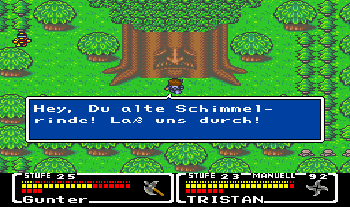Redet nach dem Kampf mit dem Baum, verkörpert durch das Gesicht vor euch. Er bedankt sich für unser heldenhaftes Handeln (*hach*) und trägt uns wie vereinbart nach Windia... doch kein Maku-Baum, sondern ein Ent?! oO Fällt euch übrigens auch auf, dass die Bäume im Hintergrund ein „GO ON KID!!“ bilden... aber, aber... Wen meinen die denn damit nur, Norte? D: