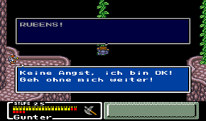 Macht das und ihr trefft auf den bewölkten Opa, der uns anweist, nach Max’ Schiff Ausschau zu halten, wenn wir in Windia sind, ehe er von dannen schwebt. Benutzt die Treppe neben euch, folgt dem Weg weiter nach unten und landet in der Dämonenfestung *oh noes* Räumt den Metzger samt Anhang aus dem Weg und schnappt euch den Luftfluch. Damit geht es auch wieder zurück nach oben und raus aus dem Turm. Wir erreichen die Hängebrücke, auf der sich Tragisches zuträgt, kaum dass wir neun Schritte gegangen sind: Hinter uns erscheint ein Monster aus dem Nichts, das für uns scheinbar eine Überraschungsparty vorbereitet hat! *yeey* Und weil Rubens sein Partyhütchen nicht finden kann und daher wütend wird, greift er das Monster an, wird von diesem jedoch die Brücke runtergekickt *oh noes* Wir müssen ihn rächen!
