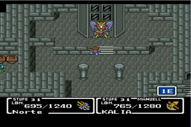 Und ab hier übernehme ich wieder, dankeschön ;D Metzelt alle Gegner, die ihr erwischen könnt, nieder (Luzifer ist diesmal neu dabei) und schnappt euch rechts aus der roten Schatztruhe das Juwelenschwert, die stärkste Waffe dieses Spiels >D Danach geht's links weiter. Sprengt zunächst die Wand vor euch auf, räumt die Gegner beiseite und greift euch aus den beiden Kisten einige Tränke, ehe ihr Vulturo ansprecht, der sich daraufhin gleich wieder dünne macht. Egal, geht ein Stück zurück und anschließend links weiter. Die untere Treppe könnt ihr gekonnt ignorieren, da sie uns ins 6. Stockwerk führt, in dem wir schon waren; bei ihr wären wir rausgekommen, wenn wir vorhin den Weg über die Podeste genommen hätten. Wer aber noch ein paar weitere Gegner grillen will, geht dort nochmal eben lang und erledigt das. Ansonsten geht's hinten bei dem Hadeswächter weiter. Nietet ihn um, betätigt den Schalter an der Wand hinter ihm und nehmt den Weg hinunter in den 2. Stock.