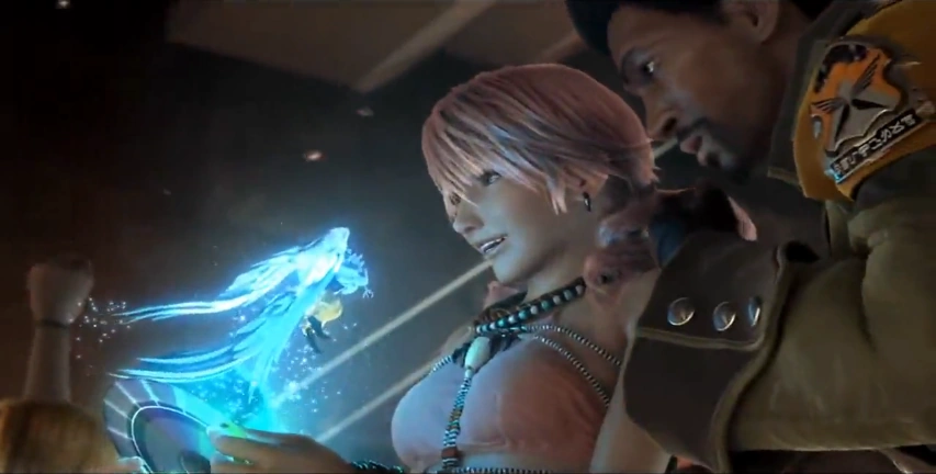 Langsam fallen Karfunkel-Discs runter, die beim Auffangen einen kleinen Karfunkel erscheinen lassen. Dieser bringt Sazh und Vanille zum Lachen. Danach schweben alle in die Luft hoch und vereinen sich. Sie breiten eine blaue schimmernde Oberfläche aus, die wie Wasser aussieht.