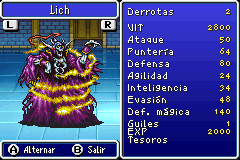 Lich es un jefe difícil, el más dificultoso de los que has luchado hasta ahora. Como un enemigo no-muerto, es débil contra día y piro, pero si tú no tienes ninguno de los dos hechizos, será aun más difícil porque los ataques físicos no tienen mucho efecto contra él. Muchas de sus tácticas incluye usar prisa para sí mismo y también te lanza morfeo. Usa remedio cuando tu grupo esté débil, y ataca entre curas. Mantén esto durante la batalla, y no podrá dejar KO a ninguno de tus personajes.
