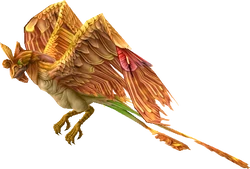 "Aviomostro leggendario che pare abbia ricevuto dagli dei l'incarico di proteggere le lontane terre del sud. Ricoperto di piume dorate, sul capo ha due corna simili a una corona. Quando vola sembra una fiamma ardente e per questo è anche chiamato "Uccello del fuoco" e venerato come bestia sacra dal potere positivo."