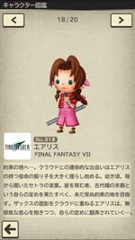 Aerith aparece como uma vision invocável e opcional. Ela mantém sua aparência original. Ela serve como um personagem representante de Final Fantasy VII.