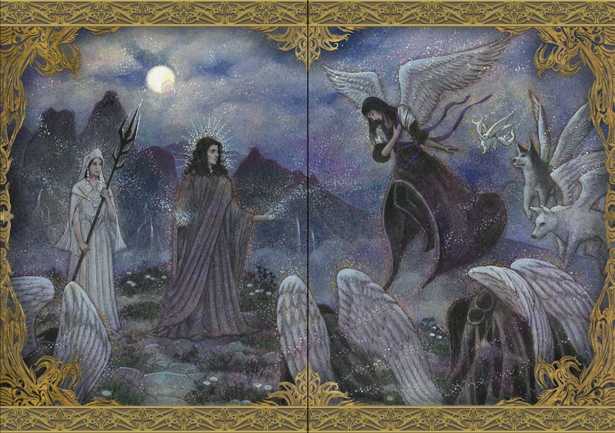 Иллюстрация из Космогонии. Боги отправляют Посланников к королю Люциса и Оракулу.