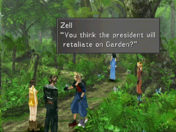 Следующим заданием становится перехват телетрансляции выступления президента. Однако сбежавший из Сада Сейфер в прямом эфире берёт того в заложники, а преследовавшая его Квистис Трип, бывший учитель Скволла, вызывает его команду в телестудию. Там Зелл проговаривается, что они из Сада. Президент угрожает напасть на Сад, если его не отпустят. Появляется волшебница Эдея и телепортируется куда-то вместе с Сейфером, спасая таким образом президента. Город оккупирует армия Галбадии, и SeeD приходится скрываться в доме, который предоставляет им член "Лесных сов" Риноа Хартилли. После того как герои решают обратиться в ближайших Сад, Сад Галбадия, Зелл начинает беспокоится о безопасности Сада Баламб и том, смогут ли SeeD противостоять армии Галбадии. Скволл холодно говорит, что это будет зависеть от силы армии, что приводит Зелла в уныние. По пути в Сад Галбадия Скволл, Квистис и Селфи теряют сознание, и Зелл понимает, что они оказались в мире снов.