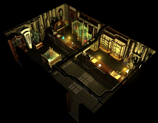 В оружейном магазине можно купить, как боевое снаряжение, так и Материю. Хотя снаружи здание кажется разделенным надвое, и у в него ведут две двери, внутри перегородок и стен нет.