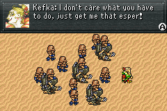 Солдат B: Слушай, не шути так. Если этот придурок станет нашим генералом, я тут же уволюсь! - ↑ Кефка: Да вы все под кайфом, мальчики и девочки... или кто вы там... Кстати, напомните мне, чтобы я как-нибудь показал вам свою коллекцию магицитов! Увидите несколько знакомых лиц!!!! Final Fantasy VI