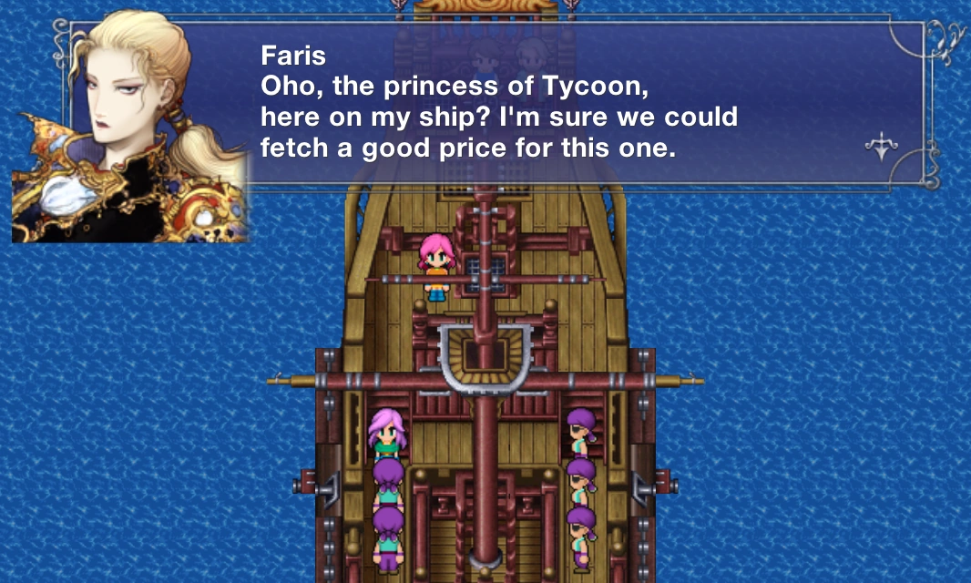 Путешественники, Барц Клаузер, Галуф Хальм Бальдесион и Ленна Тайкун, умоляют помочь им, и Ленна признаётся, что она принцесса Тайкуна. Фарис поначалу собирается потребовать за Ленну выкуп, но когда та показывает такой же кулон, как у Фарис, она меняет своё решение. Она соглашается помочь путешественникам добраться до храма Ветра, чтобы узнать, почему Ленна носит такой же кулон, но скрывает свои истинные намерения.
