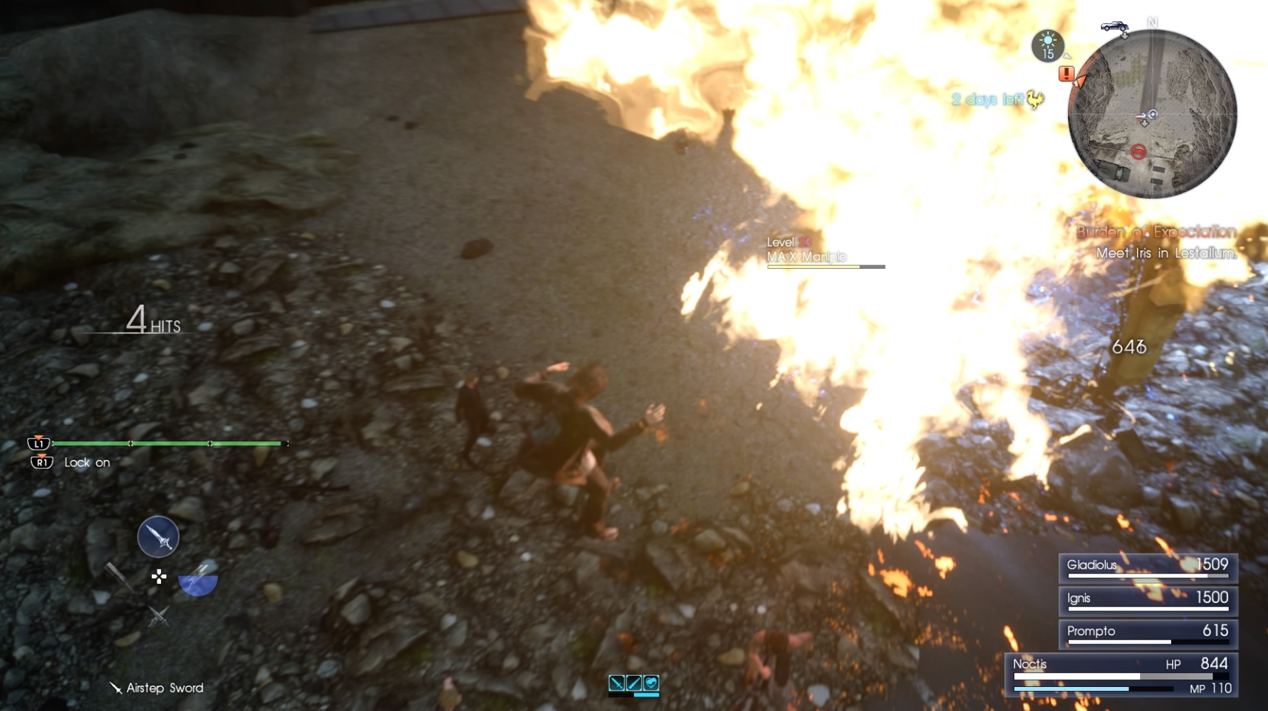 - Контратакуя некоторых врагов, как правило сильно превосходящих его по размеру (царь-бегемот, мидгардсомр, куджата, некоторые магитех-механоиды и другие), Ноктис использует огненные заклинания.