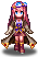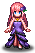 Her dressy variant wears a long purple dress and purple shoes and a purple flower accessory on the left side of her hair.