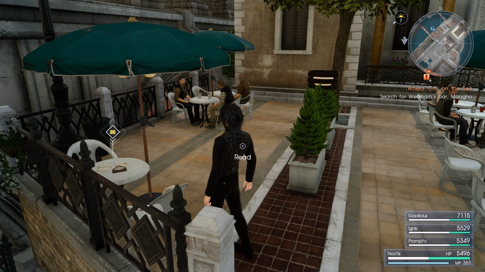 East side of town, on a cafe table occupied by two conversing men under a green parasol, a bit of southeast from Palsino Street gondola station.