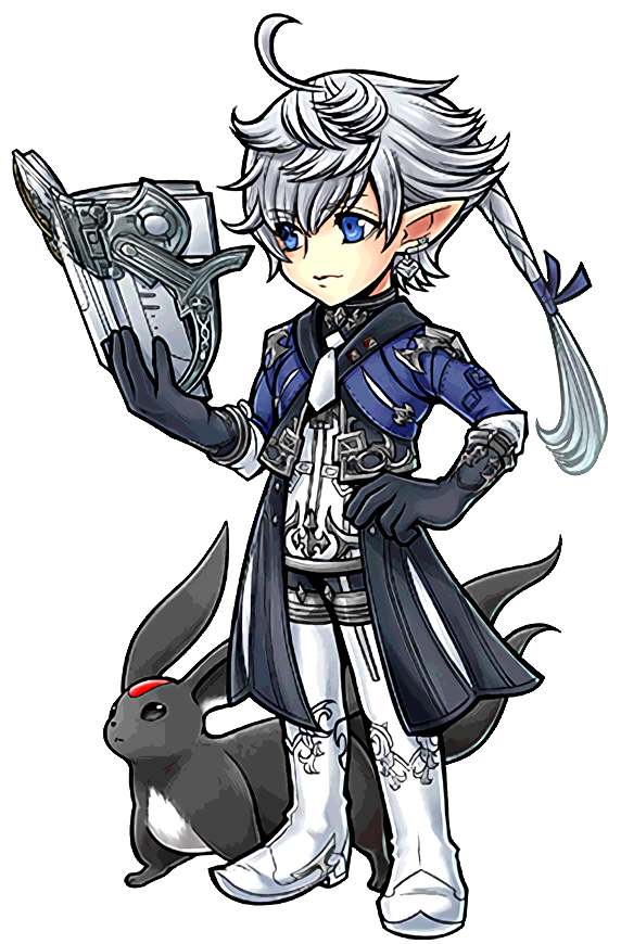 Alphinaud is depicted in his Heavensward outfit, consisting of a white-tunic with matching pants and boots, a blue coat with black hood and black gloves. He also has an Obsidian Carbuncle companion in his 2D render. As the carbuncle is a support, only one can appear on the battlefield at a tine; when all passives are taken into account, either a white Moonstone Carbuncle will appear for 6 turns, or a black Obsidian Carbuncle will appear for 4.