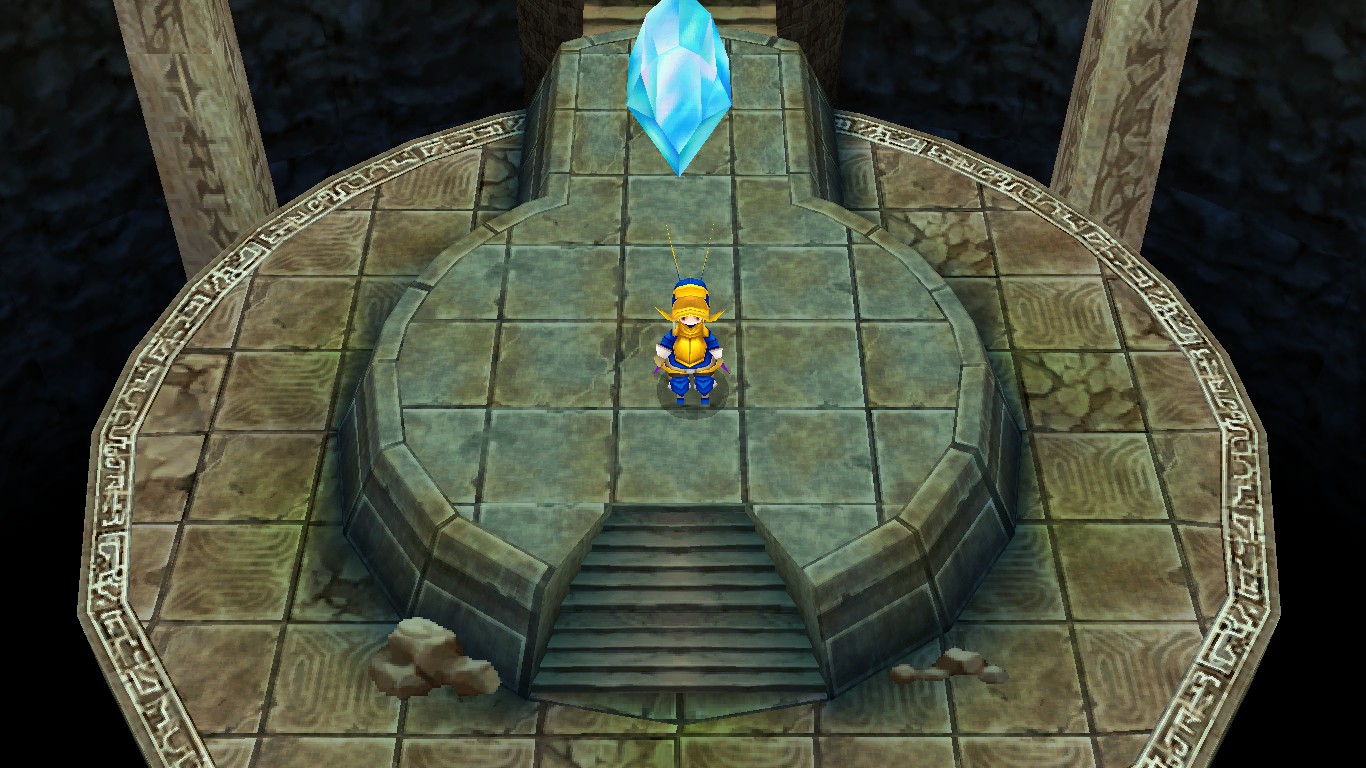 In the 3D remakes, Luneth drops into the cave through a hole and goes through the area alone. He faces the Land Turtle and meets the Wind Crystal, who tells Luneth he is one of the Warriors of the Light and tells him to search for the other three. After defeating Djinn, Luneth, Arc, Refia, and Ingus are summoned by the Wind Crystal and granted the title of Warriors of the Light, as well as the Warrior, Monk, White Mage, Black Mage, Red Mage, and the Thief jobs.