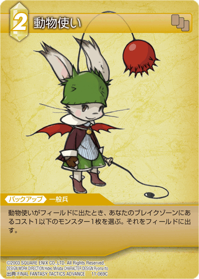 The Animist (動物使い, Dōbutsu Tsukai?, lit. Animal Trainer or Trainer [1]), abbreviated as ANM, is a recurring job, exclusive to moogles, that has appeared in the Ivalice game series.