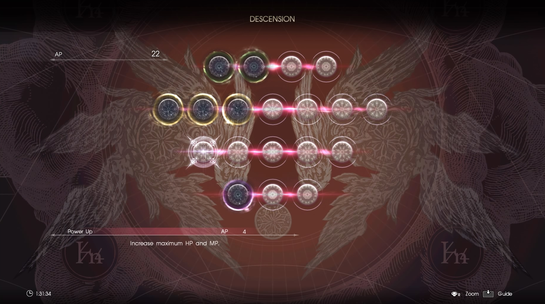 In Final Fantasy XV: Episode Ardyn, the player can improve Ardyn's parameters via Descension. Unlike the main game's Ascension menu, any node can be activated in Descension at any time without needing to trigger other nodes first. Ardyn gains AP exclusively by daemonifying enemies.