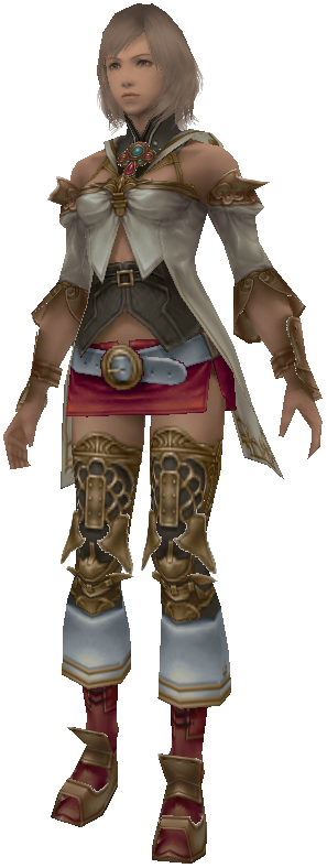 Her main attire comprises of a white and gold cropped shirt over a leather waist swath and a bright pink miniskirt secured by a thick light-blue belt. She wears metal thigh-high leg-guards and a pair of gold metal open-toed shoes with darker pink stockings. Her wedding gown is similar in design to her white and gold shirt, with a long, fitted white skirt and a feather-adorned white veil. She briefly dons a black mourning gown, and in the final scenes, seen dressed in a peach gown with loose sleeves. In Final Fantasy XII: Revenant Wings, Ashe wears her standard Final Fantasy XII outfit.