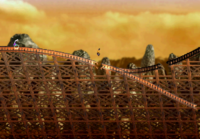 Reaching the railroad will lead to a save point, as the path ahead leads along thin railway tracks. Along this path are three pitfalls in the rail structure; falling deliberately and holding