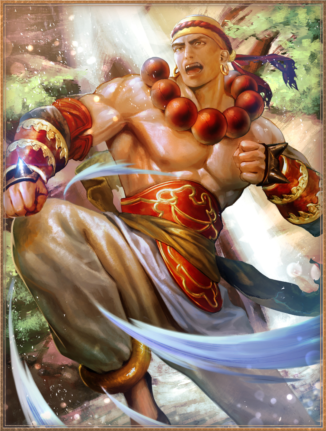 2★ - No. 0022:A monk who sought only strength of body and mind until the war from which he had sworn to isolate himself threatened the village he once called home. Baurg's inability to save his people even after his years of training left him to die with a heart full of regrets. As a vision, he now seeks to use the power of his fists and strong will to fight for what is fair and just.