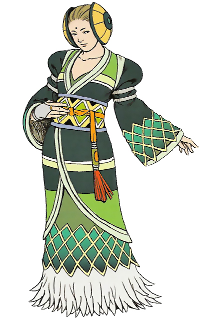 Belgemine has fair skin, dark eyes, and brunette hair drawn into yellow cauls—the ornaments on the sides of her head. She dresses mainly in greens and whites and has a round black mark resembling a bindi or tilak on her forehead. She wears a wrap robe sectioned with bands. Her sleeves are cuffed by bands above the elbow, puffing the shoulders out, and the bell parts of the cuffs have a latticed diamond pattern. The inside of the lattice gradiates from sea green to darker green. She wears fingerless gloves held by a gold ring on the middle finger. Under this robe, Belgemine wears an olive dress with a low V-neck, which displays the same latticework pattern starting above the knees, ending above the ankle, and another skirt of feathery material. Her belt resembles an obi edged in pale bluish gray and is diamond-patterned tied with a thin orange sash ending in a large white, green, and orange bead and a red tassel.