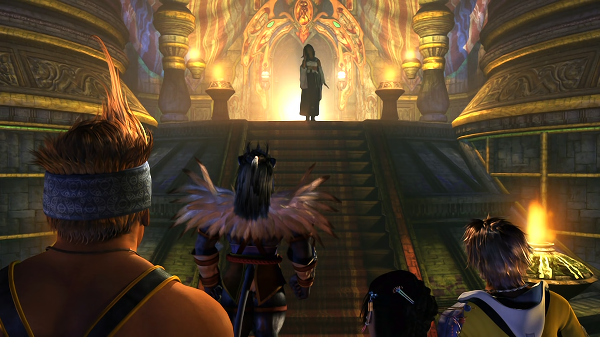 Wakka takes Tidus to Besaid Village and introduces him to the temple where a summoner is praying for the fayth. Tidus gets concerned when he hears the summoner hasn't been back for a long time. Though only the summoners and their guardians are allowed inside the heart of the temple, Tidus does not care and ventures deeper anyway to check on them. He comes across Lulu and Kimahri who are not happy to see him there. The door to the Chamber of the Fayth opens and Yuna stumbles out, having obtained her first aeon, Valefor, and thus become a full-fledged summoner.