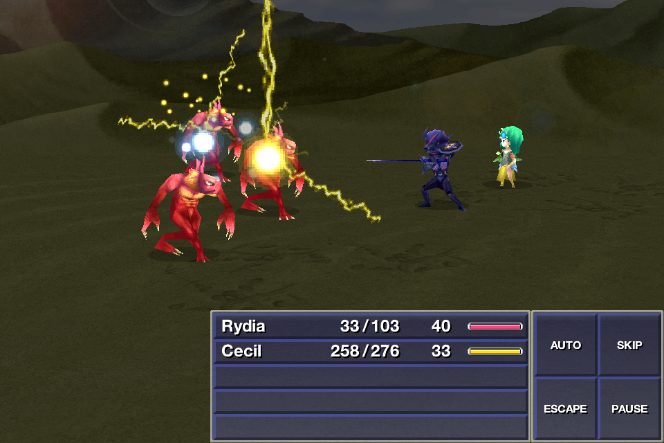 5 | Minor Lightning-elemental damage to one or all enemies. Casting time of 1. It has a spell power of 16 in 2D versions, and 20 in 3D versions. | Rydia (2D): LV 5 Rydia (3D): Known Palom: Known Thunder Rod Lightning Claws (3D) |