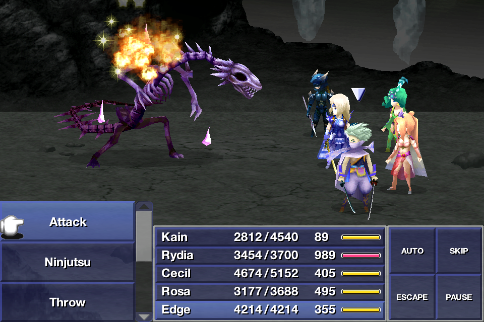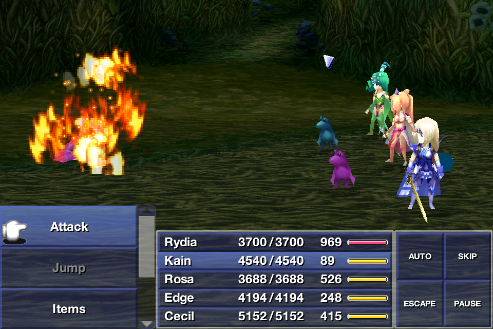 5 | Minor Fire-elemental damage to one or all enemies. Casting time of 1. It has a spell power of 16 in 2D versions, and 20 in 3D versions. | Rydia: Event Palom: Known Flame Rod Flame Sword (3D) Flame Claws (3D) |