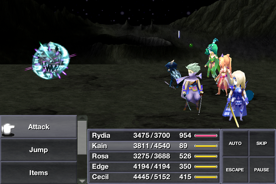 50 | 55 | Massive non-elemental damage to one enemy. It has a spell power of 400 in 2D versions, and 160 in 3D versions. | Rydia (2D): LV 55 Rydia (3D): LV 60 Palom (2D): LV 52 Palom (3D): LV 55 |
