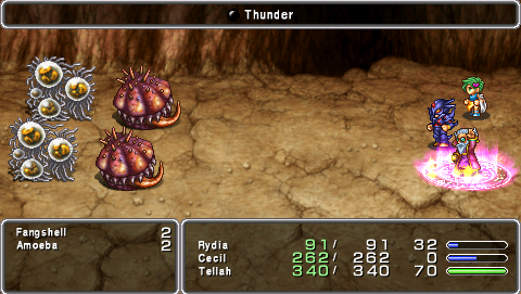 15 | Moderate Lightning-elemental damage to one or minor Lightning-elemental damage to all enemies. Casting time of 3. It has a spell power of 64 in 2D versions, and 50 in 3D versions. | Rydia: Event Palom (2D): LV 13 Palom (3D): LV 14 |