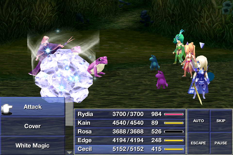 5 | Minor Ice-elemental damage to one or all enemies. Casting time of 1. It has a spell power of 16 in 2D versions, and 20 in 3D versions. | Rydia (2D): LV 2 Rydia (3D): Known Palom: Known Ice Rod Ice Claws (3D) |