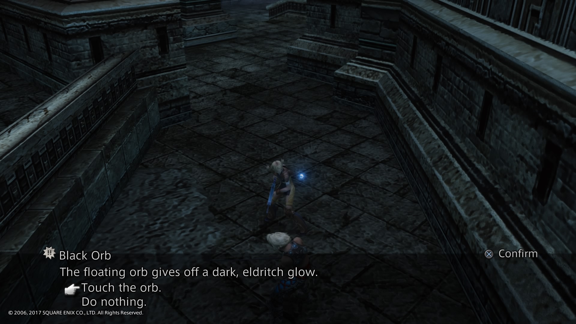 Every third enemy slain in the original PlayStation 2 version, or every enemy in the Zodiac versions, starting with the first enemy in a zone, will drop a Black Orb that must be interacted with to pick up before it flies away after several seconds. In the First Ascent, the player must place an orb on three different pedestals located on each side of the central waterfall for the seal on the locked door to fade. Once the player completes the events at the Pharos, the creatures in the First Ascent will stop dropping Black Orbs. Any additional orbs collected prior can still be used later in Subterra, where the enemies are at a much higher level.