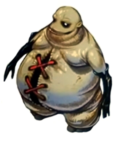 Cúchulainn is a hideous, rotund, and bald humanoid figure with a wide mouth, short and thick legs, and a hole in his torso held together by stitches. His arms are comparatively much thinner and he wears black opera gloves. He can pull open the hole in his torso to reveal a mouth with sharp teeth, which is used for his spells. Somewhat noticeable on his sprite, he has what appears to be bulbous segments on his glutes. His official artwork has these secreting a white liquid, which is implied to be toxins.