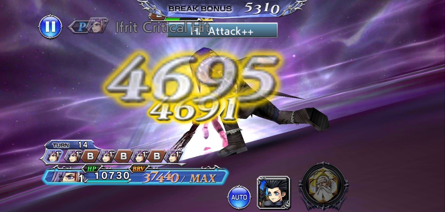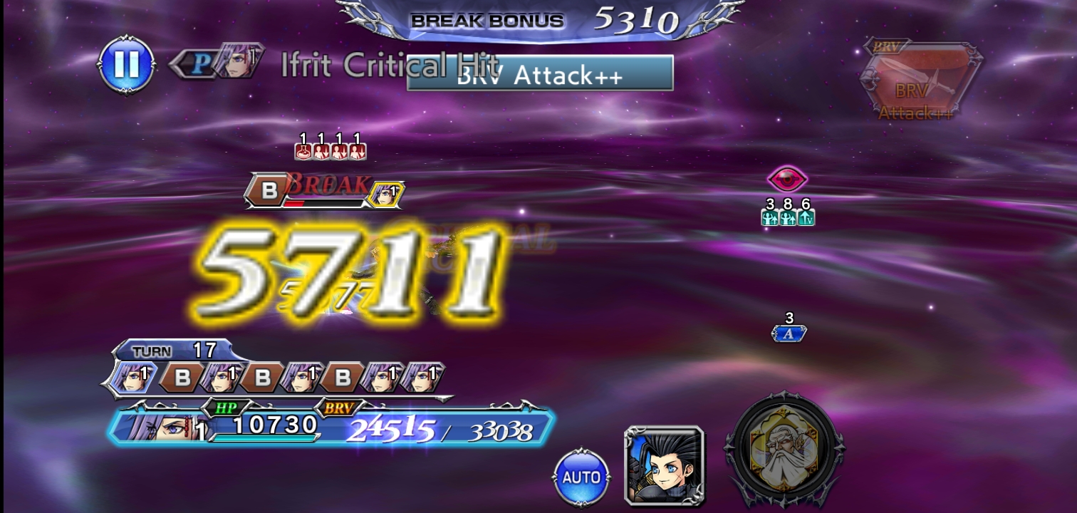 Grants GuardianRaises Max BRV and Attack. for 4 turns. Grants 1 stack of Body and SoulRecovers HP and BRV based on number of stacks. for 2 turns (maximum of 5 stacks). When Body and Soul is at 5 stacks, turns into Pulsar Burst+4-HIT melee BRV + HP attack.. When Heart of Chaos is active: Slightly raises Max BRV and Attack. Prevents KO and leaves HP value at 1. When HP < 1%: Tremendously recovers HP. Removes Heart of Chaos. | ||||