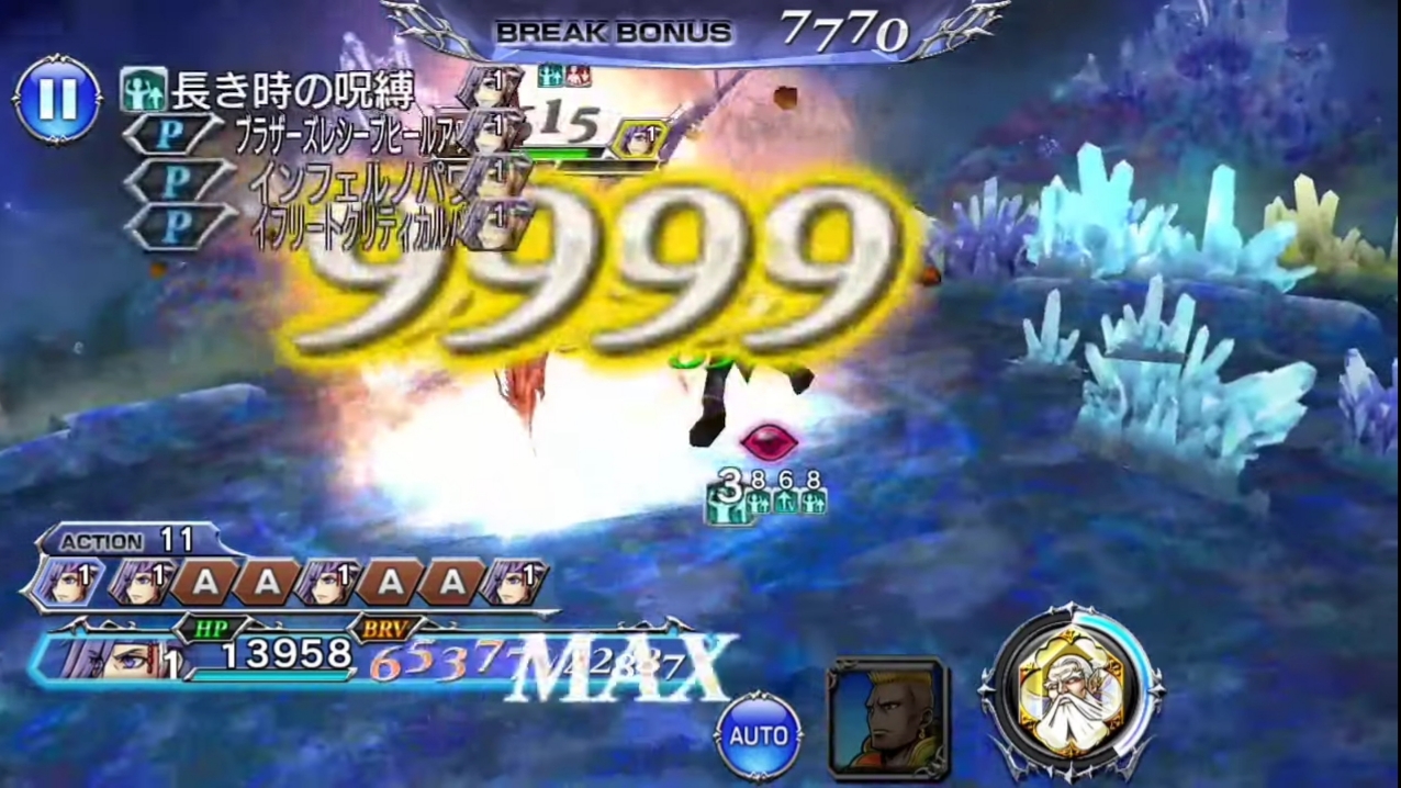 Inflicts Max BRV Down I - Chaos, Defense Down I - Chaos, Poison - Chaos for 3 turns. Inflicts Doom - ChaosInflicts Break upon expiration. for 2 turns. Grants 1 additional stack of Body and Soul and extends its duration by 1 turn. When Body and Soul is at 5 stacks, turns into Eye of Bahamut+4-HIT melee BRV + HP attack.. | ||||