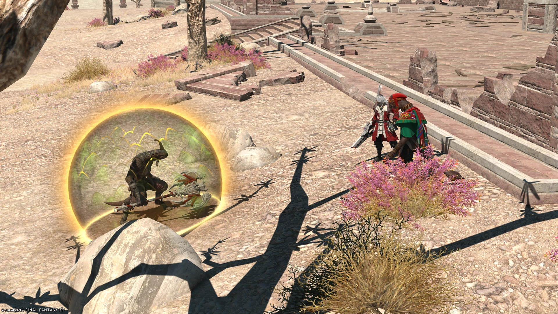 Ceetol Ja arrived in Rhalgr's Reach where she inquired about the thief. Ceetol Ja learned that the description matched the leader of a bandit gang that lurked around Virdjala, and Ceetol Ja went to the area alone. While Ceetol Ja tended to the wounds of a merchant who had been attacked, the Warrior of Light who had been sent by Raholl Ja arrived to help her. The Warrior of Light then went to help the merchant's companion who was still fighting the bandit group. When the man tried to attack, Chalteaufite, the leader of the group, used the Steelhog Vessel to create a shield that blocked any attacks. As Ceetol Ja arrived at the scene of the confrontation, Kaqool Ja, a Mamool Ja mercenary who was about to attack the Warrior of Light saw Ceetol Ja and retreated. Ceetol Ja asked Chalteaufite to return the treasure, but he refused, saying that only he would know how to harness the Vessel's power. While Chalteaufite fled, Ceetol Ja took the wounded to Rhalgr's Reach.[1]