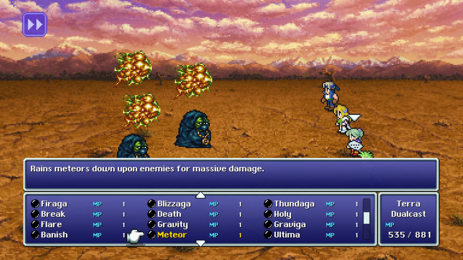 Terra, Celes, and Relm each have access to female-exclusive equipment that makes them the strongest potential spellcasters. Between them, Terra's use of Trance allows her to double her damage (or healing) output and reach 9999 damage easiest, while Relm has the highest base Magic stat and will be a naturally stronger passive spellcaster, and Celes's Runic makes her well-suited to a defensive role. However, Terra and Celes's varied weapon selection means they could just as easily be built toward physical damage instead, depending on player preference. Strago and Gogo may also be good choices due to their focus on spellcasting (and Gogo's versatility), but do not have the same potential as Terra, Celes, or Relm.
