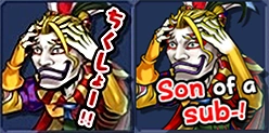 One of Kefka's stickers was censored in the global version. The texts in the image of "Chikushou!" (ちくしょう!, damn it!) sticker was changed to "Son of a sub!" However, the game shares the same voice overs with the Japanese version. The Japanese sticker can also be considered censored, since it's not exactly what Kefka said in Final Fantasy VI script (kusso, くっそ). Despite being a foul language, chikushou means "damn it", while kusso has various meanings, including "damn it", "scum", and "shit". The voice actor also voiced this sticker as "Chikushaaaaa!" instead of saying the word directly.