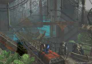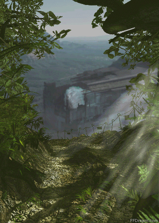 The entrance leads in from the forest surrounding the site. It consists of a complex network of metal catwalks, iron ladders, and lead beams patrolled by Esthar soldiers. The first metal catwalk has a Sleep draw point at the start, and forks into two different catwalks: the catwalk on the right leads to a ladder straight down, while the catwalk on the left leads further inside to a second screen. This then leads to a three-way junction: the path on the left which leads nowhere, the path on the right with a Confuse draw point, and the path heading straight forward to a hole in the ground with a ladder leading below to the depths.