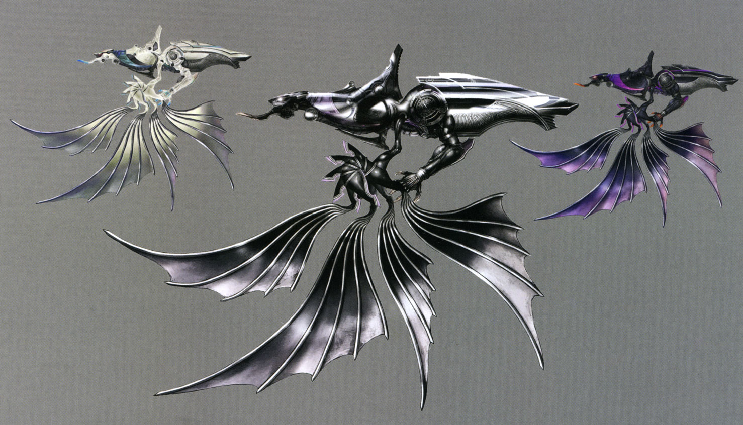 It is a darker palette swap of Fang's Bahamut from Final Fantasy XIII, the difference being that the wings are always present on Chaos Bahamut, whereas they only manifested in Gestalt Mode in Final Fantasy XIII. Chaos Bahamut is named after the destructive substance known as chaos, a formless mass of dark energy that exists in the unseen realm. Caius has mastery over the forces of chaos due to a gift given to him by the goddess Etro, the Heart of Chaos. It being a "dark" form of Bahamut makes it somewhat akin to the Dark Aeons from Final Fantasy X.