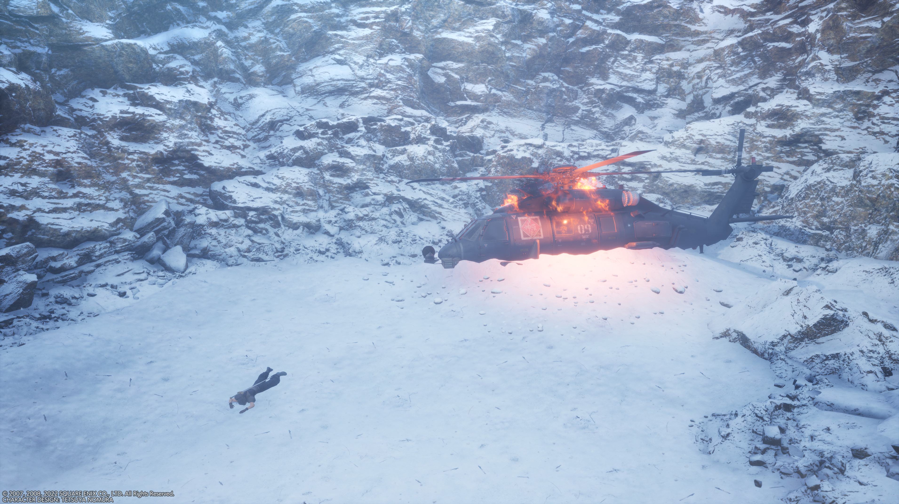 The Shinra helicopter crashes to the mountains.