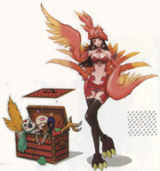 By the events of Final Fantasy XIII-2, Chocolina has been granted the ability to assume a human form by the goddess Etro. In her human form she wears thigh-high stockings with shoes shaped like chocobo feet, feathered gloves, a red bikini-like top, a red covering around her groin that includes plumage behind her, and a headdress shaped like a chocobo's head. The outfit is identical to those worn by the Chocobo Girls in Serendipity and Yusnaan. Chocolina has Mog and Carbuncle dolls in her treasure chest.