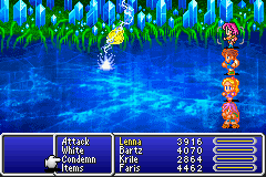 Condemn is the Oracle job's level 1 ability, exclusive to the Advance and the now-discontinued 2013 versions of Final Fantasy V. It allows the use of several abilities, both elemental- and status-inducing, at no MP cost. Execution time depends on the Oracle's level, requiring 15 time units at level 1, 10 at level 2, 7 at level 3, and 5 when the job is mastered. The ability will fail on heavy targets.