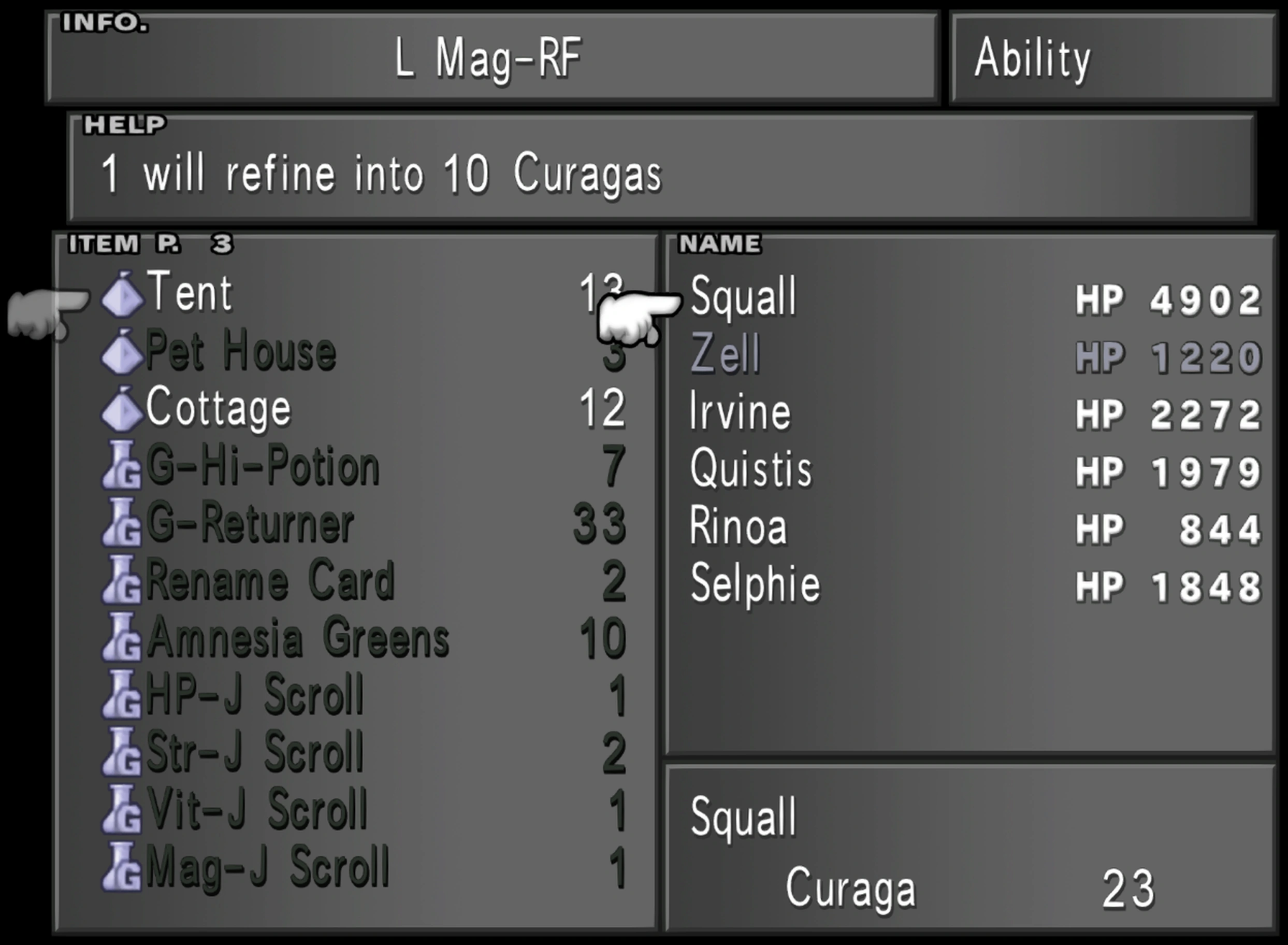Curaga can be obtained relatively early using the Guardian Force Siren's ability L Mag-RF. The player can refine ten Curaga spells from Tents, which can be bought from shops. By completing tests to raise the player's SeeD rank, it is easy to build up enough gil to buy thirty Tents, which can be refined to 100 Curaga spells for three party members.