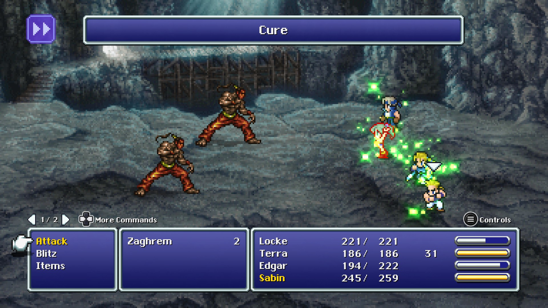 Cure is a Healing spell in Final Fantasy VI. It is the basic curative spell that can be used to restore HP to one target or an entire party. Against undead enemies, it will damage them instead. It is learned naturally by both Terra and Celes, and can later be earned by other party members through magicite.
