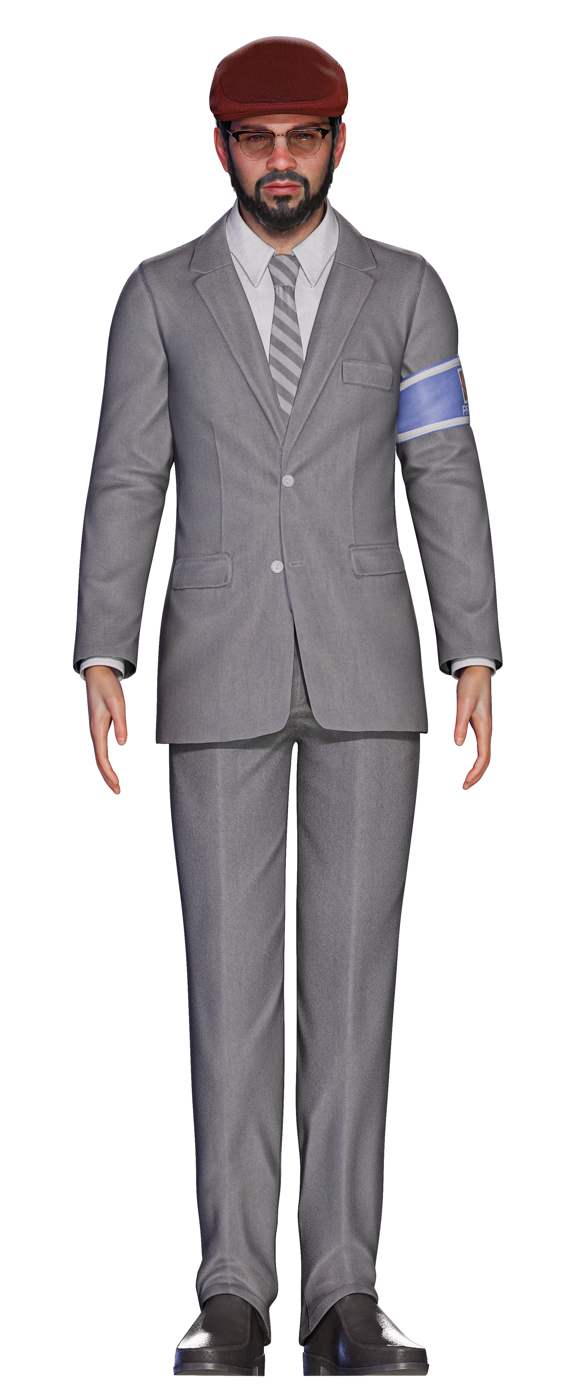 Damon is a middle-aged man with an average build. He has fair skin, short black hair, a full beard, and blue eyes. He wears a burgundy cap, black-rimmed glasses, a dark gray suit over a white dress shirt with a gray striped tie, dark gray dress pants, and black dress shoes. He also wears blue Shinra-logo press band.
